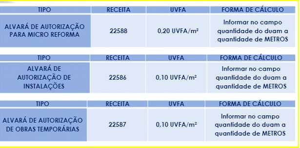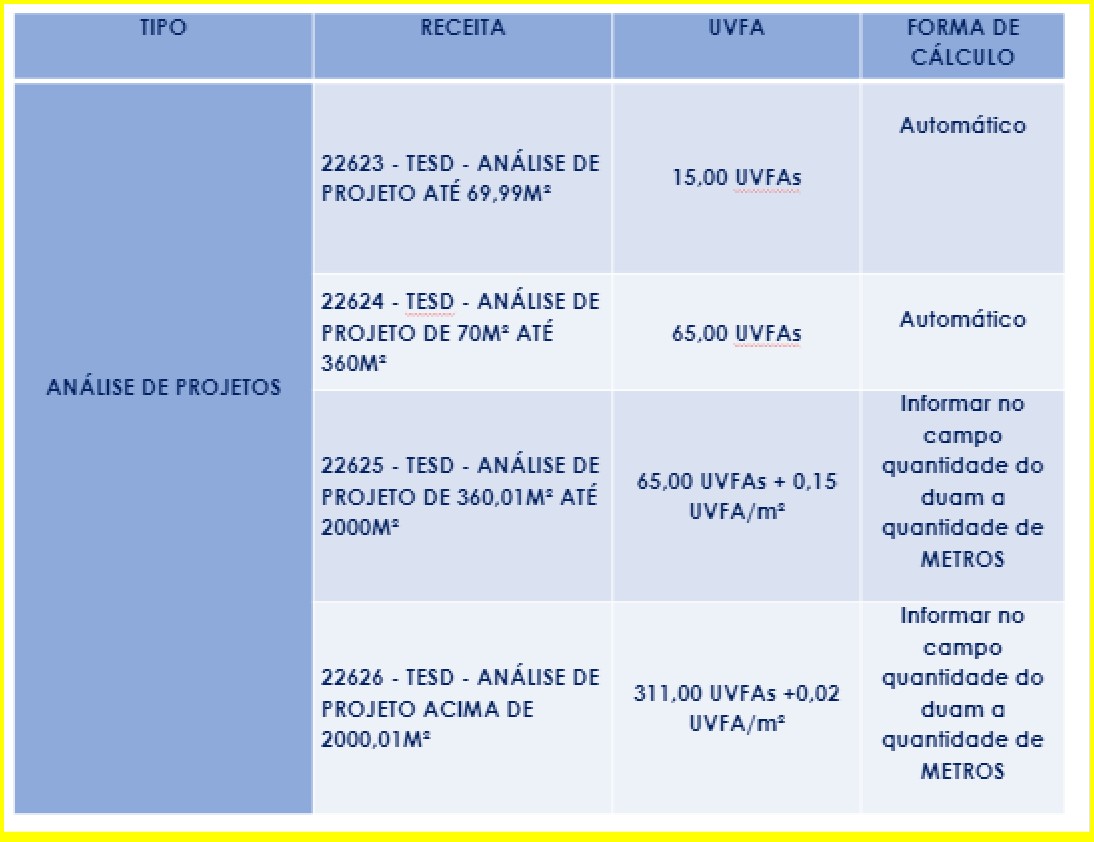 Tabela para cobrança da taxa de Analise – Protocolo