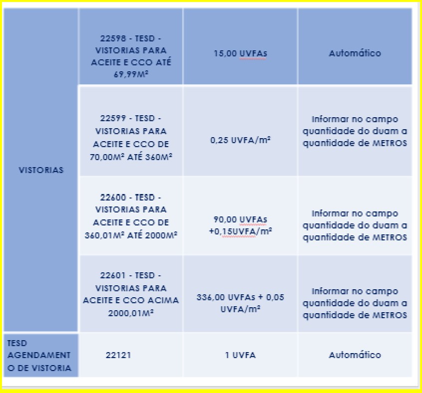Taxa: Receita 24 (Certidão de Conclusão de Obra -HABITE-SE) sendo 0,30 uvfa/m² / Receita 42 (Certidões Sec.Regulação) / Vistoria conf. tabela na observação / Receita 22121 (Agendamento de Vistoria).